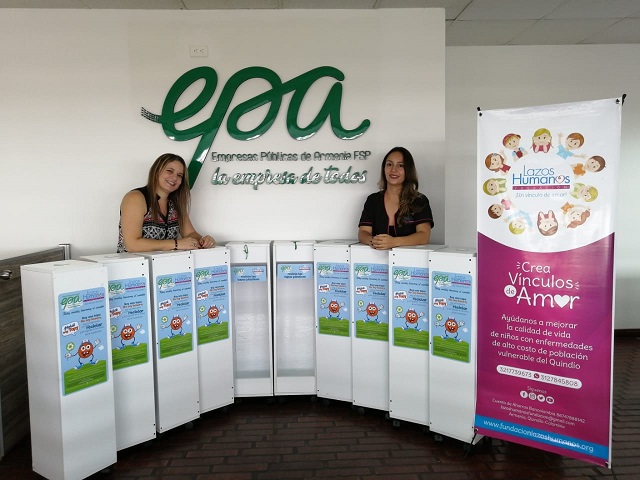 A través de la fabricación y donación de 10 cubículos para la recolección de tapas plásticas a diferentes instituciones educativas de Armenia, EPA se vincula con la fundación Lazos Humanos, realizando un trabajo articulado de responsabilidad social que busca agrupar la mayor cantidad de tapas de botellas de gaseosas, agua y detergente que muchas veces van directo a la basura, para comercializarlas y obtener recursos que subsidien y mejoren la calidad de vida de niños con enfermedades de alto riesgo y costo de la ciudad.