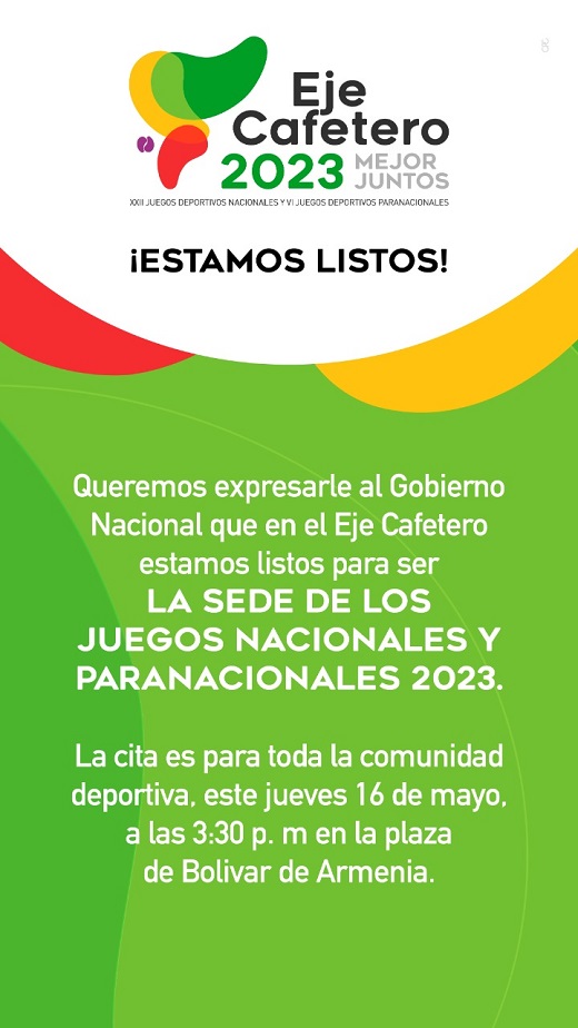 “El objetivo de la cita es manifestarle a la Presidencia de la República que en Armenia y el departamento del Quindío ESTAMOS LISTOS para ser sede de los Juegos Nacionales y Paranacionales del 2023”, dijo Olga Lucia Fernández Cárdenas, gerente de Indeportes Quindío.