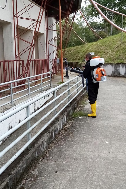 Como parte del acompañamiento que brinda la Secretaría de Salud de Armenia en el albergue temporal dispuesto por la alcaldía de Armenia y la Cámara de Comercio de la ciudad en el Centro de Ferias y Exposiciones Cenexpo, el área de salud pública de la dependencia realizó una jornada de desinfección y fumigación en dichas instalaciones con el fin de garantizar que las personas que permanecen allí no tengan riesgo de contagio del COVID 19.