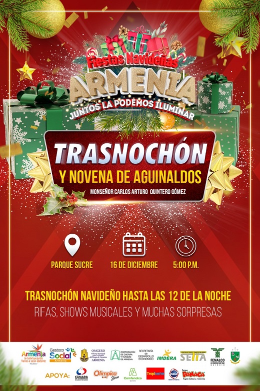 A partir de las 5 y media de la tarde en el Parque Sucre, todos los armenios, en especial niños, niñas y adultos mayores, podrán disfrutar de la jornada de bienvenida a las novenas de aguinaldos, 'Trasnochón', la cual estará llena de actividades para recibir esta bonita época del mes más alegre del año.